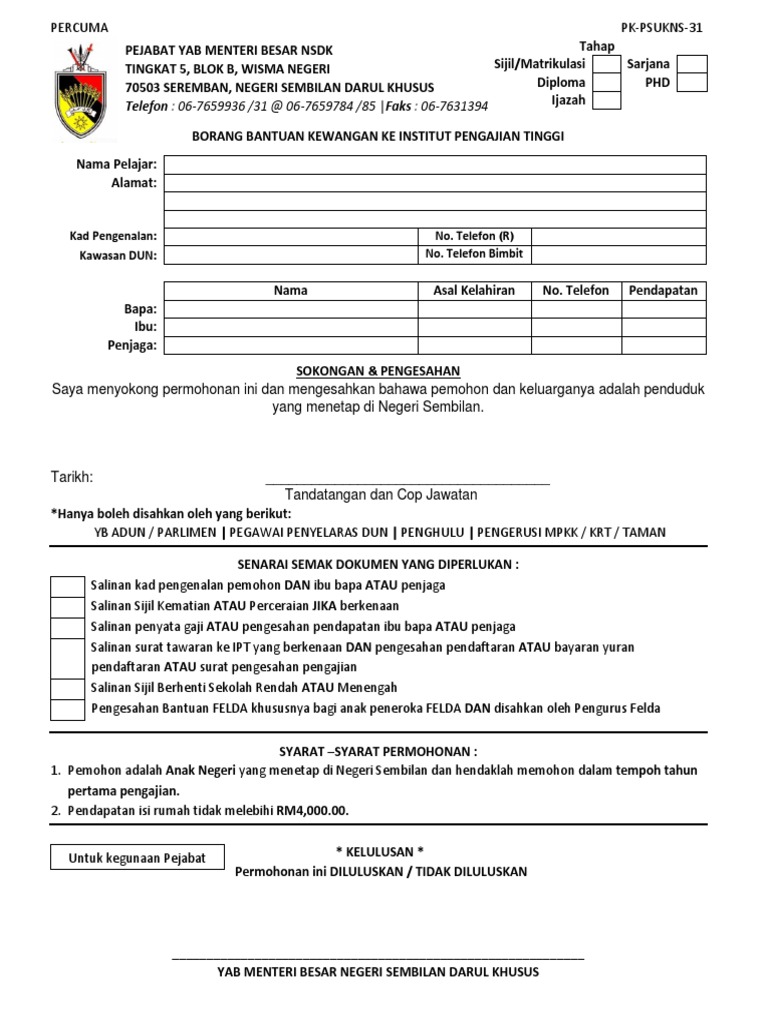 Borang Permohonan Bantuan Kewangan JKM 18 Borang Kajian Semula Bantuan Kewangan JKM 20 Jumlah Pengguna Atas Talian. Pengajian Ijazah Pertama dalam negara sahaja. Memo Jawatankuasa Pengurusan Covid-19 UNISEL.
